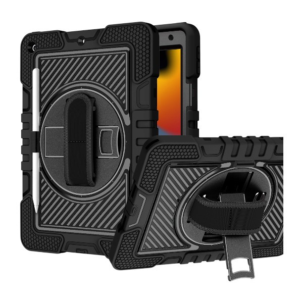 iPad 7/8/9/10.2″ – Hand/Shoulder/Pencil Strap Kickstand Tough Case (Black)